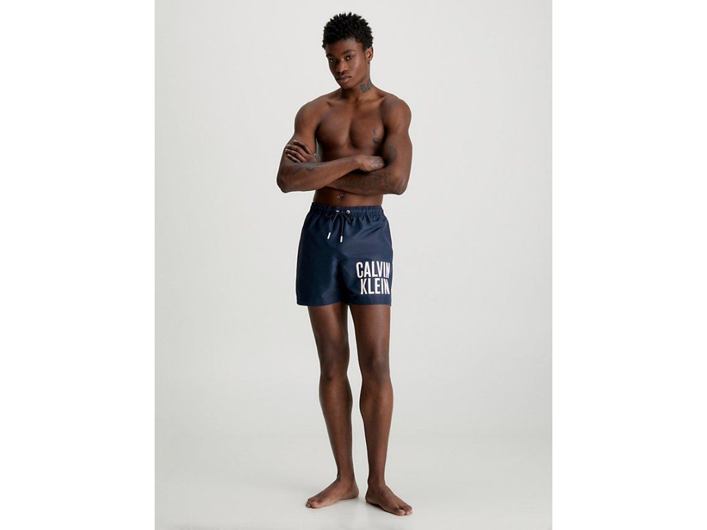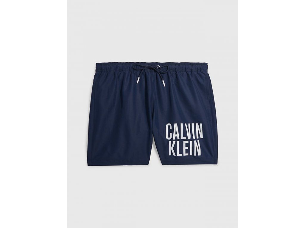 Pánské šortky na plavání Calvin Klein ze 100% recyklovaného polyesteru v tmavě modré barvě. Trendy, pohodlné, kvalitní plavky s nápisem CALVIN KLEIN na nohavici.